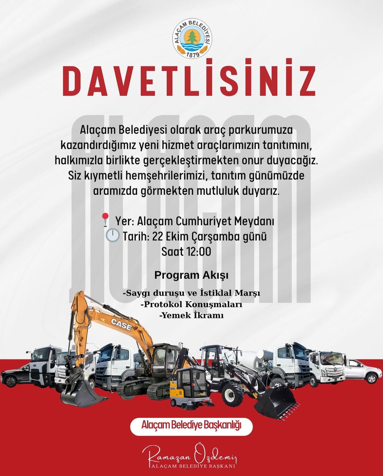 Alaçam Belediyesi, 2025 yılı içerisinde araç parkuruna kazandırdığı yeni hizmet araçlarını tanıtmak amacıyla halkla buluşuyor.Cumhuriyet Meydanı’nda gerçekleştirilecek olan “Araç Tanıtım Günü” etkinliği, 22 Ekim 2025 Çarşamba günü saat 12.00’de yapılacak. Programda protokol konuşmalarının ardından yemek ikramı da gerçekleştirilecek.Belediye Başkanı Ramazan Özdemir, yapılan çalışmalar hakkında bilgi vererek şu ifadeleri kullandı:> “Belediyemizin hizmet kalitesini artırmak ve vatandaşlarımıza daha hızlı, daha etkin hizmet sunmak amacıyla araç filomuzu genişlettik. Yeni araçlarımızla birlikte ilçemizin her noktasına daha verimli şekilde hizmet ulaştıracağız. Bu araçlar sadece bugünü değil, geleceğimizi de güçlendirecek yatırımların bir parçasıdır. Tüm hemşehrilerimizi bu tanıtım gününe davet ediyor, birlikte bu gururu paylaşmaya bekliyoruz.”Alaçam Belediyesi’nin araç parkuruna kazandırdığı yeni araçlar, çeşitli hizmet birimlerinde kullanılmak üzere göreve başlayacak.